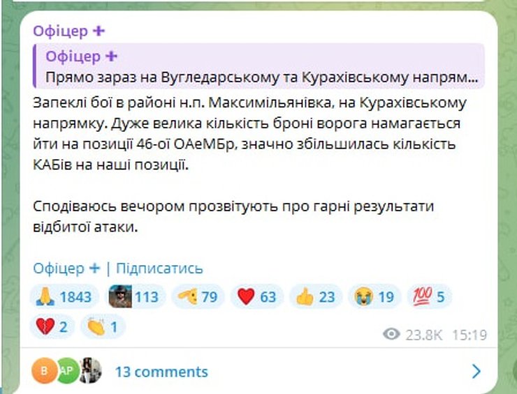 "Дуже велика кількість броні ворога намагається йти на позиції 46-ї ОАеМБр, значно збільшилася кількість КАБів на наші позиції. Сподіваюсь, увечері прозвітують про гарні результати відбитої атаки", — написав він.