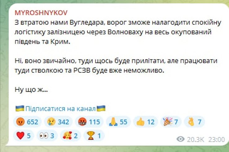 "З втратою нами Вугледара, ворог зможе налагодити спокійну логістику залізницею через Волноваху на весь окупований південь та Крим. Ні, воно звичайно, туди щось буде прилітати, але працювати туди "стволкою" та РСЗВ буде вже неможливо", — вважає він.