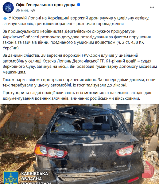 Пізніше обласна прокуратура повідомила деталі. FPV-дрон знищив автомобіль Mitsubishi Lancer, унаслідок чого 61-річний водій загинув на місці, а трьох жінок госпіталізували. Після удару транспортний засіб врізався в стіну будинку. Жертвою ворожої атаки став суддя Верховного суду. Він і його пасажирки приїхали в селище, щоб роздати гуманітарну допомогу місцевим жителям.