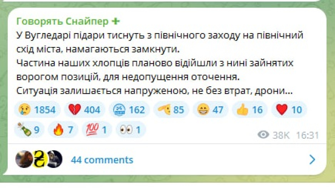 "У Вугледарі п**ари тиснуть з північного заходу на північний схід міста, намагаються замкнути. Частина наших хлопців планово відійшли з нині зайнятих ворогом позицій, для недопущення оточення. Ситуація залишається напруженою, не без втрат", — проінформував він.
