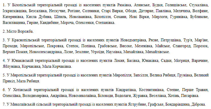 Зазначені заходи оголосили у Білопільській та Ворожбянській міських громадах, Краснопільській та Хотинській селищних громадах, Юнаківській, Миропільській та Миколаївській сільських територіальних громадах.