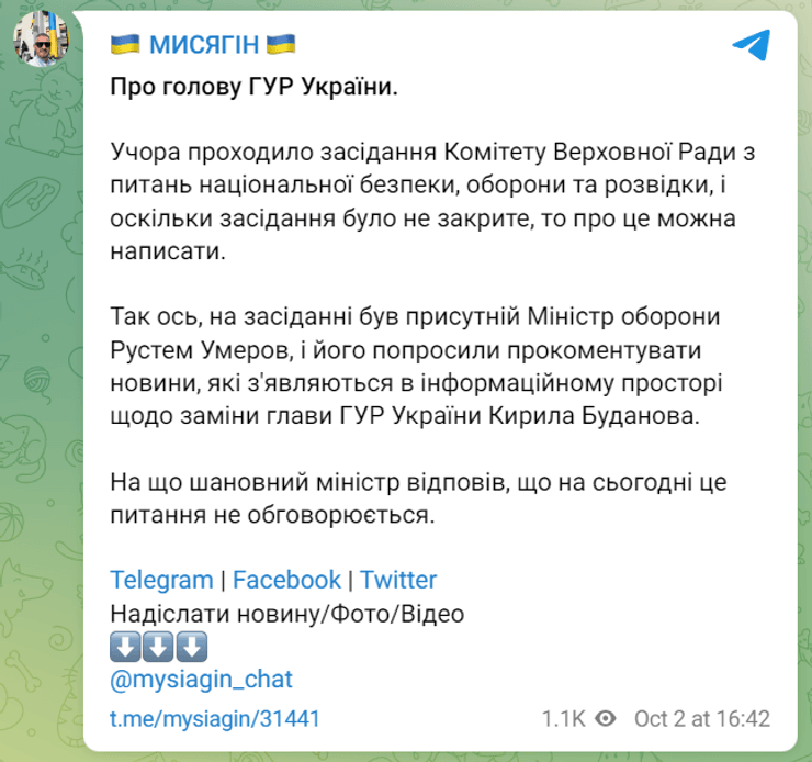 "На засіданні був присутній міністр оборони Рустем Умеров, і його попросили прокоментувати новини, які з'являються в інформаційному просторі щодо заміни глави ГУР України Кирила Буданова. На що шановний міністр відповів, що на сьогодні це питання не обговорюється", — написав депутат.