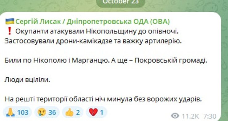 "Окупанти атакували Нікопольщину до опівночі. Застосовували дрони-камікадзе та важку артилерію. Били по Нікополю і Марганцю. А ще — Покровській громаді. Люди вціліли. На решті території області ніч минула без ворожих ударів", — проінформував він.