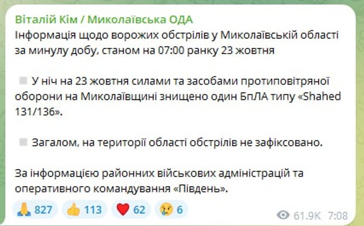 Як повідомив зранку 23 жовтня голова Миколаївської ОВА Віталій Кім, у ніч проти 23 жовтня силами та засобами протиповітряної оборони на Миколаївщині знищено один БпЛА типу "Shahed 131/136".