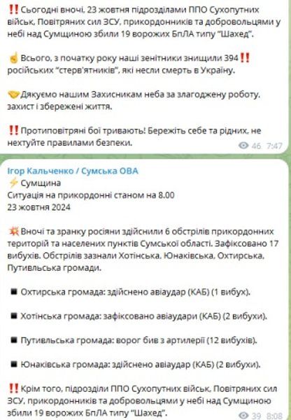 "Сьогодні вночі, 23 жовтня підрозділами ППО Сухопутних військ, Повітряних сил ЗСУ, прикордонників та добровольцями у небі над Сумщиною збили 19 ворожих БпЛА типу "Шахед". Всього, з початку року наші зенітники знищили 394 російських "стерв'ятників", які несли смерть в Україну. Дякуємо нашим Захисникам неба за злагоджену роботу, захист і збережені життя. Протиповітряні бої тривають", — написав він.