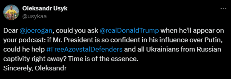 "Шановний Джо Роґане, чи не могли б ви запитати Дональда Трампа, коли він з'явиться у вас на подкасті: якщо пан президент такий упевнений у своєму впливі на Путіна, чи міг би він негайно допомогти звільнити захисників "Азовсталі" та всіх українців із російського полону? Час не терпить зволікань", — написав Усик