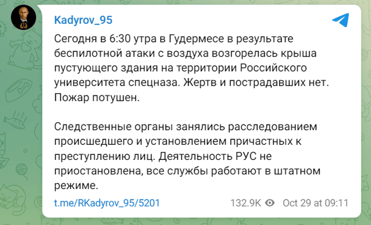 У вівторок, 29 жовтня, безпілотник атакував будівлю на території Російського університету спецназу (РУС) в Гудермесі. Внаслідок удару виникла пожежа. Про це повідомив глава Чечні Рамзан Кадиров.