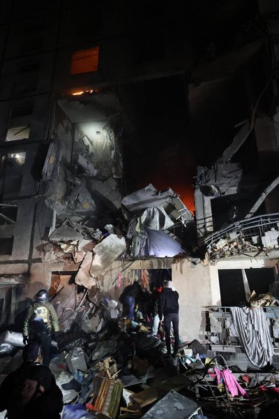 Він додав, що є влучання у четвертий поверх багатоповерхівки. Зруйнований майже весь під'їзд, а на місці пожежі виникла пожежа.