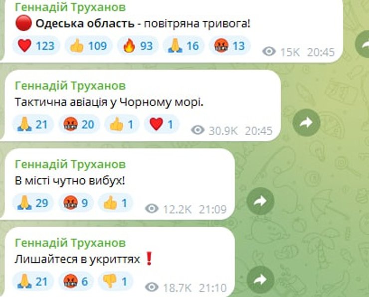 "В місті чутно вибух. Лишайтеся в укриттях", — написав міський голова Одеси Геннадія Труханова.