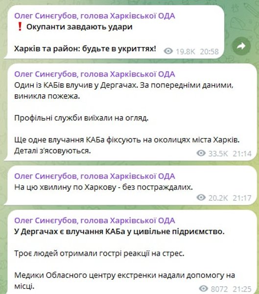 Повідомляється, що один з КАБів влучив у Дергачах. За попередніми даними, виникла пожежа на цивільному підприємстві, у трьох людей гостра реакція на стрес. Ще одне влучання КАБа зафіксували на околицях Харкова.