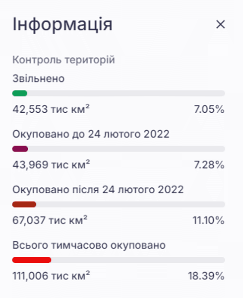 Згідно з мапою DeepState, станом на 19 листопада окуповано 18,39 39% земель, тобто 111,006 тис. км². Звільнено 7% територій.