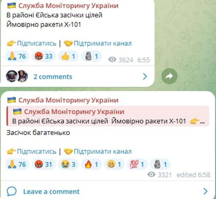 "В районі Єйська засічки цілей. Ймовірно ракети Х-101. Засічок багатенько", — йдеться в повідомленні.