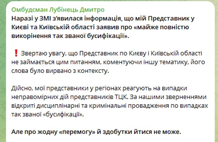 Представник омбудсмена Дмитра Лубінця у столичному регіоні Микита Козиренко заявив, що в Україні нібито вдалося майже повністю викорінити так звану "бусифікацію". Сам Лубінець зазначив, що останній не займається цим питанням.