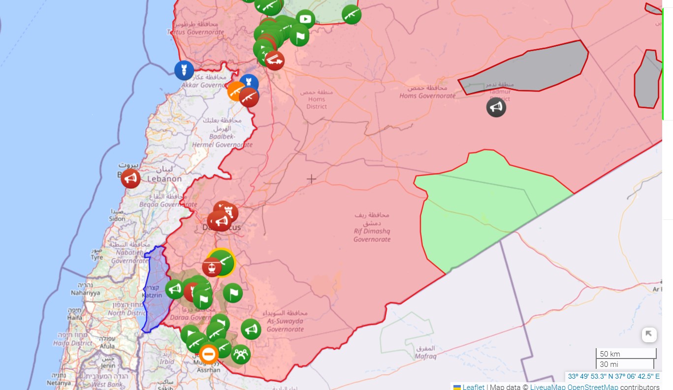 На карті бойових дій liveuamap можна побачити зелені позначки у південній частині Сирії — це інформація про нові точки боїв, яких не було напередодні, 5 грудня. Тим часом вже о 16:00 6 грудня є близько десятка бойових зіткнень, крім того, люди почали протестувати проти уряду Асада у місті Бусра аль-Шам у східній провінції Дараа. Автори карти відшукали інформацію, опубліковану в акаунті X "спостерігачем і документувальником порушень прав людини на півдні" Mohammad Alasakra. Згідно з дописом, повстанці захопили блокпост на трасі за містом Габагеб і відібрали в асадівських солдатів всю військову техніку та зброю. Габагеб, до якого дістались повстанці, розташоване за 30 км на південь від Дамаска.