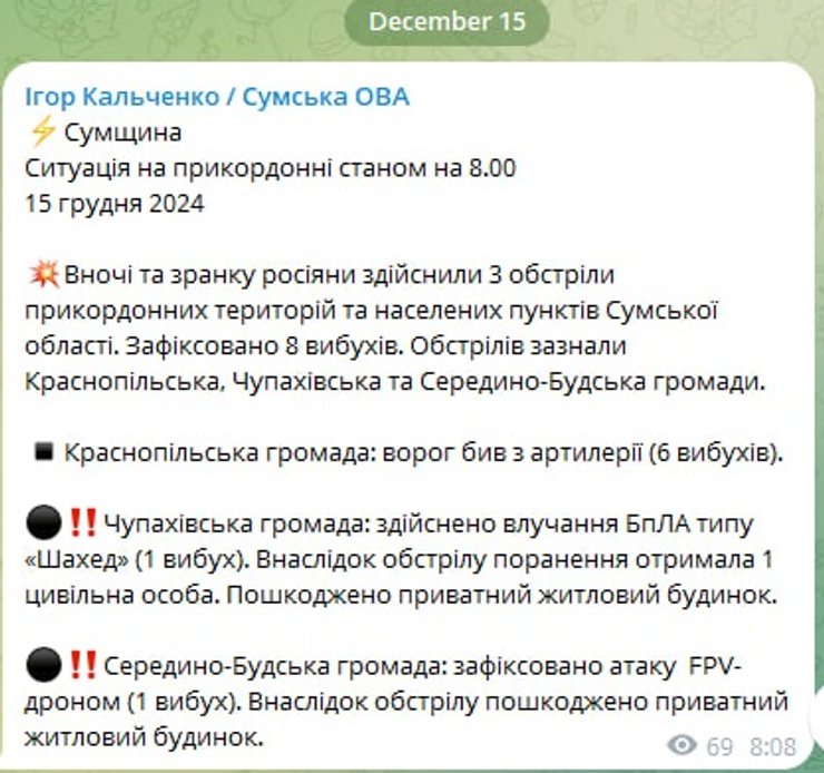 Як повідомив голова Сумської ОВА Ігор Кальченко, станом на 8.00 ранку 15 грудня вночі та зранку росіяни здійснили 3 обстріли прикордонних територій та населених пунктів Сумської області. Зафіксовано 8 вибухів. Обстрілів зазнали Краснопільська, Чупахівська та Середино-Будська громади.