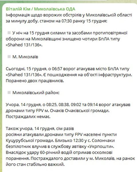 "Сьогодні, 15 грудня, о 06:57 ворог атакував місто БпЛА типу "Shahed 131/136". Є пошкодження на об'єкті інфраструктури. Поранено двох працівників", — проінформував голова ОВА Віталій Кім.