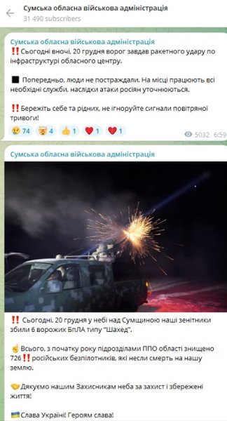 Вночі, 20 грудня ворог завдав ракетного удару по інфраструктурі обласного центру. Як повідомили в Сумській ОВА, попередньо, люди не постраждали. На місці працюють всі необхідні служби, наслідки атаки росіян уточнюються.