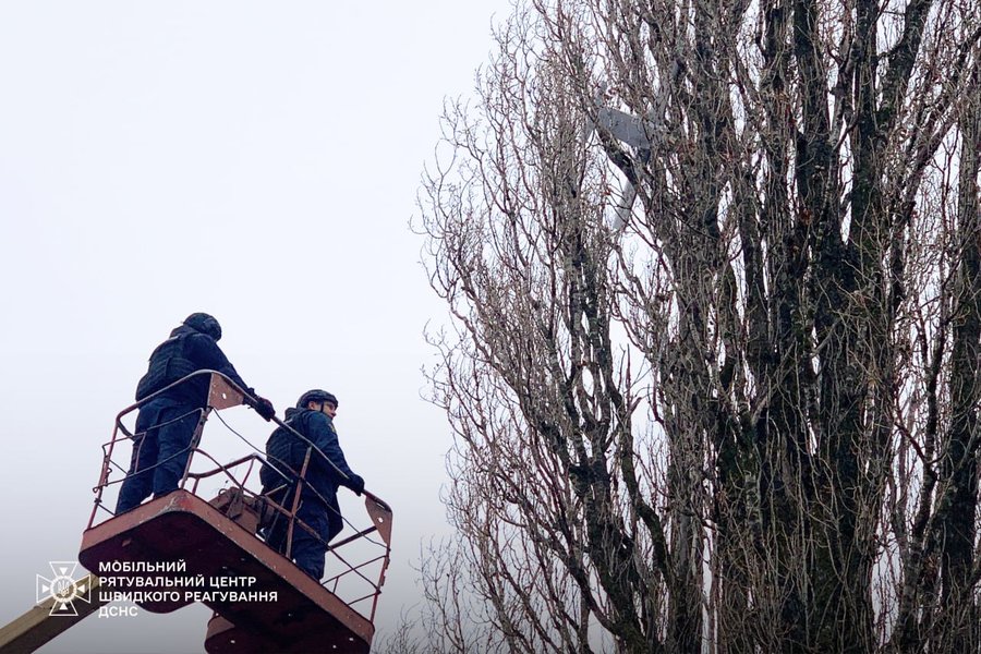 Залишки ворожого безпілотника-приманки зняли з дерева рятувальники ДСНС. Російський апарат не мав бойової частини й не становив загрози.