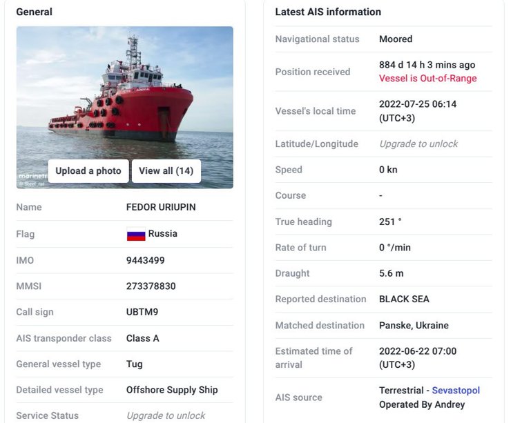 Буксир "Федор Урюпин" згідно з базою Marinetraffic має російський прапор, але власником зазначено українське ДАТ "Чорноморнафтогаз".