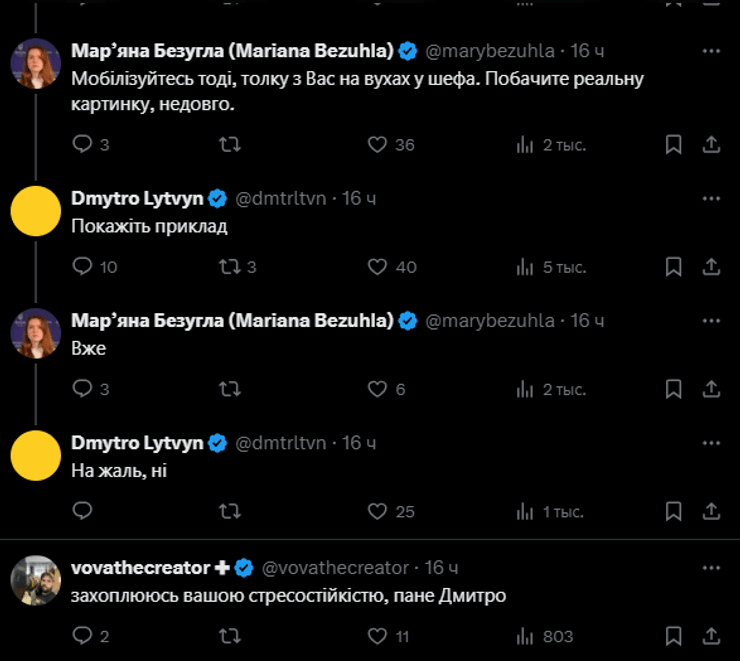 Народна депутатка України, член комітету з питань зовнішньої політики Мар’яна Безугла посперечалася з радником президента України з питань комунікацій Дмитром Литвином. Публічна суперечка сталася у соціальній мережі X. У результаті обоє закликали один одного записатися до лав армії.