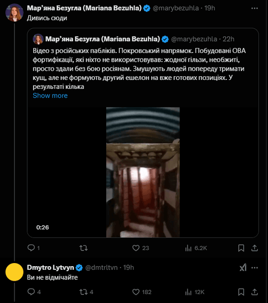 Згодом у коментарі прийшла Безугла. Нардепка звернула увагу Литвина на свій допис про Покровський напрямок, у якому розкритикувала керівництво української армії. Вона поширила відео з російських пабліків з побудованими ОВА фортифікаціями, які ніхто не використовував.