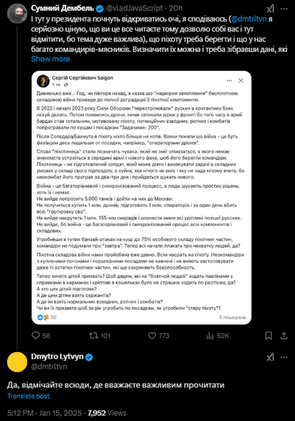 Один з користувачів позначив Литвина у дописі щодо необхідності вберегти піхоту. У відповідь радник Зеленського попросив відмічати його всюди, де це важливо.