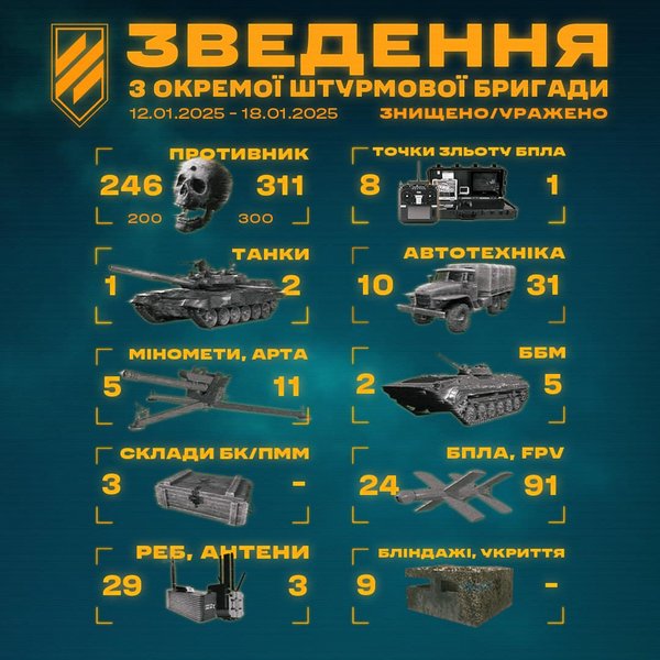 "Серед них новенький БПЛА-розвідник "СКАТ 350М". А ще "Shahed-136", він же "Герань-2", баражуючий боєприпас "ZALA Lancet", крила "Орлан-10", "ZALA-Z16", "Supercam-S350". Та "Mavic". Кожна збита ціль — наша врятована гармата, і піхотинці на передових позиціях, які продовжать нищити пі*арів, автомобіль з екіпажем або машина евакуації, яка вивозить поранених", — зазначили в пресслужбі бригади.