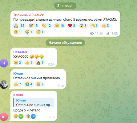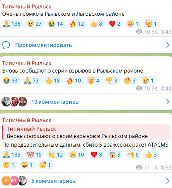 У Telegram-каналах міста вранці з 8:40 писали про "дуже гучні" звуки і нібито збиття п'яти ракет ATACMS. Очевидці в коментарях зазначали, що частина ракет досягла мети.