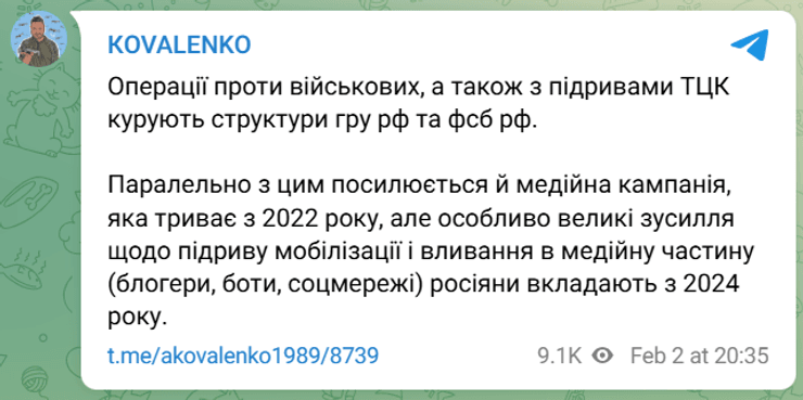 "Паралельно з цим посилюється й медійна кампанія, яка триває з 2022 року, але особливо великі зусилля щодо підриву мобілізації і вливання в медійну частину (блогери, боти, соцмережі) росіяни вкладають з 2024 року", — написав Коваленко.