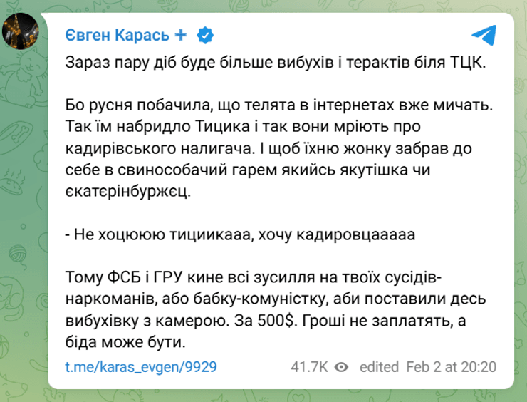 Командир 413-го окремого батальйону безпілотних систем "Рейд" Євген Карась припустив, що найближчими днями вибухи біля будівель ТЦК почастішають. За його словами, спецслужби РФ кинуть на це всі свої сили.