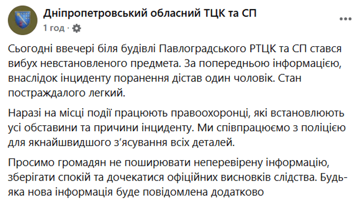 У Дніпропетровському обласному ТЦК зазначили, що стан постраждалого легкий. Громадян просять не поширювати неперевірену інформацію, зберігати спокій та дочекатися офіційних висновків слідства.