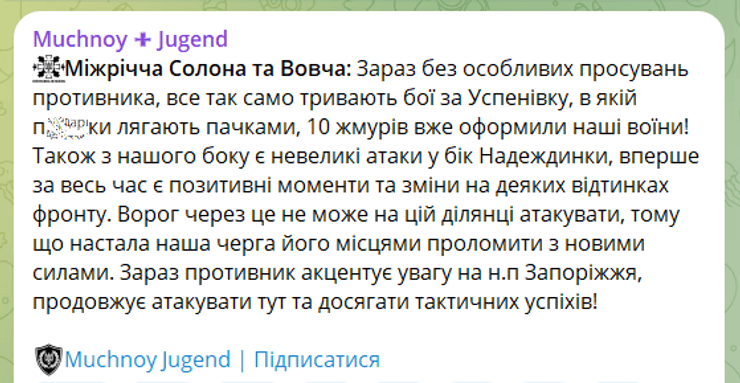 Водночас український військовий з позивним "Мучной" повідомляв, що у районах міжріччя Солона та Вовча наразі без особливих просувань противника. Тривають бої за Успенівку, під час яких представники російської армії, за словами бійця ЗСУ, "лягають пачками".