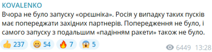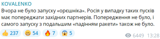"Вчора не було запуску "Орєшніка". Росія у випадку таких пусків має попереджати західних партнерів. Попередження не було, і самого запуску з подальшим "падінням ракети" також не було", — написав він.