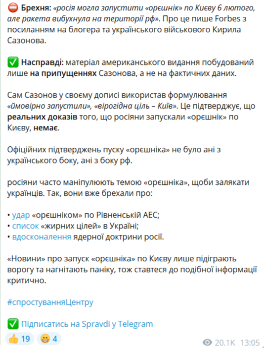 "Брехня: "Росія могла запустити "Орєшнік" по Києву 6 лютого, але ракета вибухнула на території РФ". Про це пише Forbes з посиланням на блогера та українського військового Кирила Сазонова. Насправді: матеріал американського видання побудований лише на припущеннях Сазонова, а не на фактичних даних", — йдеться в повідомленні.