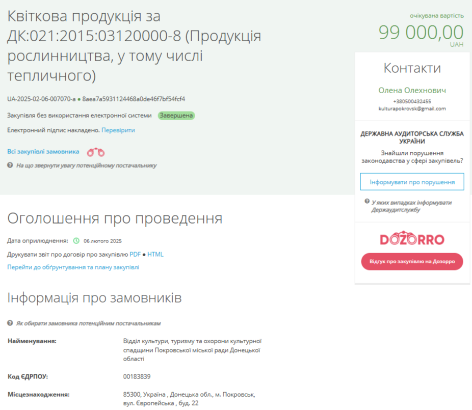 В середу, 5 лютого, відділ культури, туризму та охорони культурної спадщини Покровської міської ради Донецької області уклав угоду на придбання квіткової продукції для нагородження. Вартість угоди склала 99 тисяч гривень. Тендер з’явився у системі публічних закупівель Рrozorro 6 лютого.