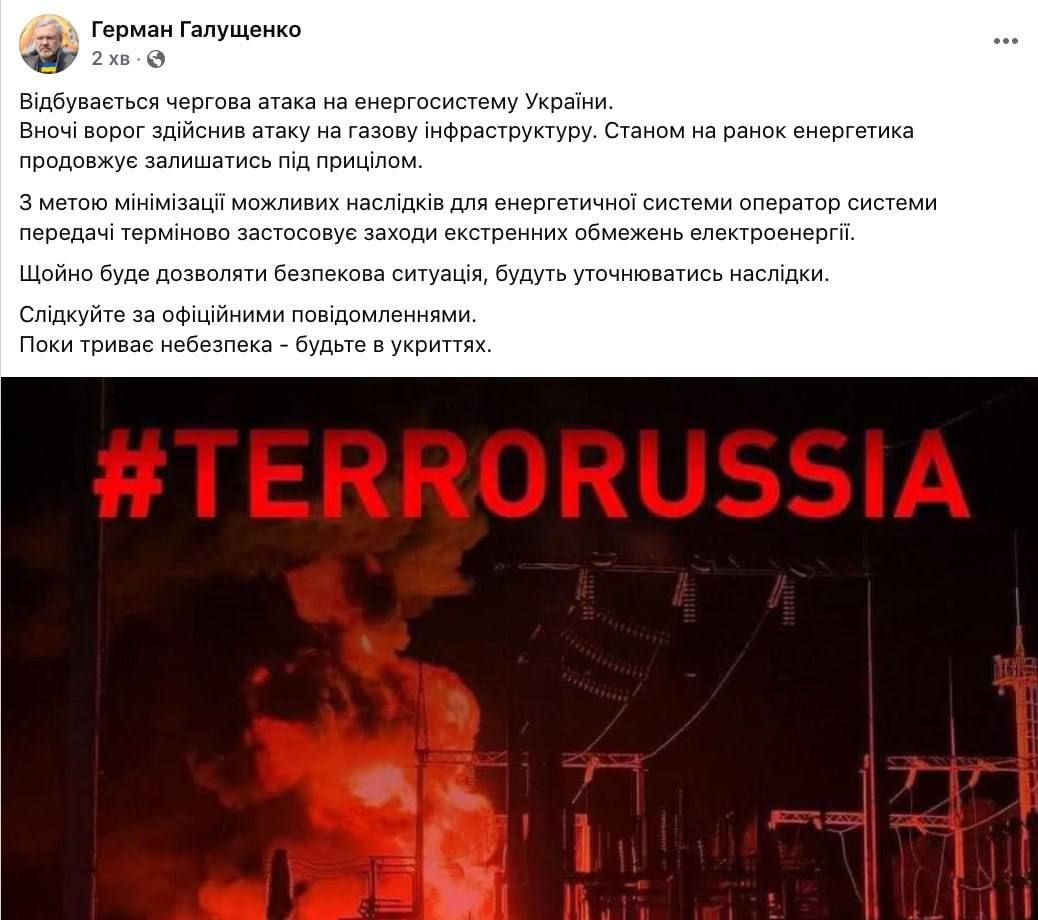 Про екстрені відключення світла по всій території України також повідомив міністр енергетики Герман Галущенко. Чиновник написав на своїй сторінці у соцмережах про те, що вночі ворог також "здійснив атаку на газову інфраструктуру України".