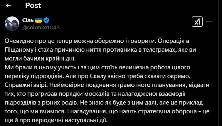 "Про [425-й окремий штурмовий полк] Скала, звичайно, треба сказати окремо. Справжні звірі. Неймовірне поєднання грамотного планування, відваги тих, хто прогризав порядки ЗС РФ, і налагодженої взаємодії різних родів військ", — розповів Солонько.