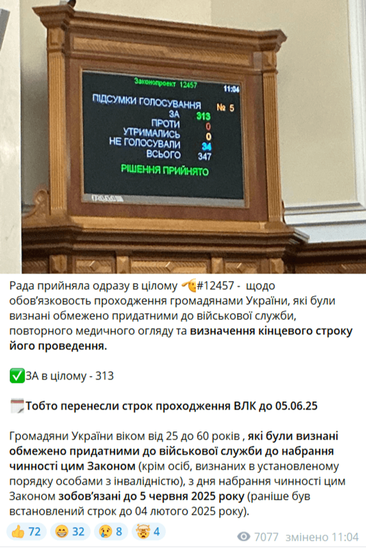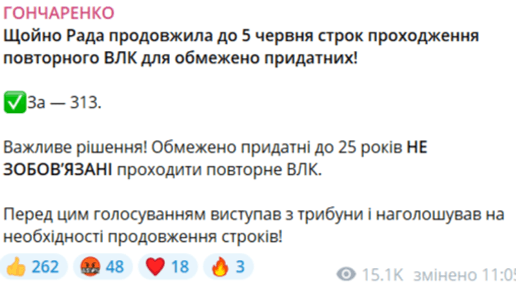 За словами народного депутата, "за" проголосувало 313 нардепів. Таким чином, термін проходження ВЛК перенесли до 5 червня 2025 року.