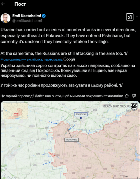 "Україна здійснила серію контратак на кількох напрямках, особливо на південний схід від Покровська. Вони увійшли в Піщане, але наразі незрозуміло, чи повністю відбили село. Водночас росіяни продовжують атакувати в цьому районі", — писав він в мережі Х.