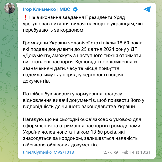 Чоловіки-громадяни України віком від 18 до 60 років, які перебувають за кордоном і які подали документи на оформлення паспорта у держпідприємстві "Документ" до 25 квітня 2024 року, вже з наступного тижня зможуть отримати свої готові документи. Про це повідомив міністр внутрішніх справ Ігор Клименко.