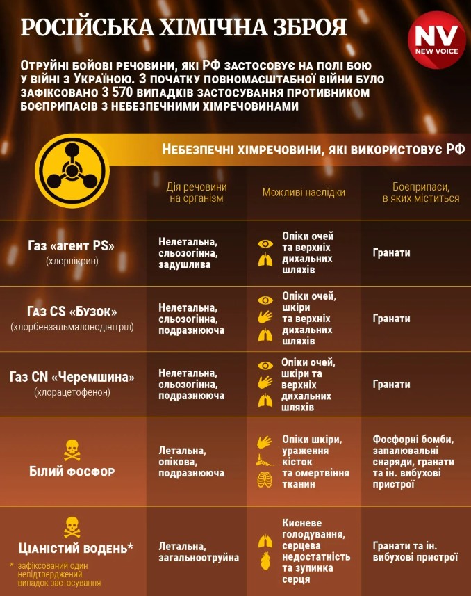 Тим часом медіа NV опублікувало інфографіку про види отруйних речовин, які ЗС РФ використовують у різних видах зброї. На інфографіці, складеній на основі відкритих даних, бачимо різні види гранат та бомби.