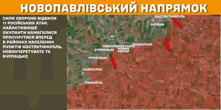 За інформацією Генштабу ЗСУ, на Новопавлівському напрямку Сили оборони відбили 11 російських атак. Найактивніше окупаційні війська намагалися просунутися вперед у районах населених пунктів Костянтинопіль, Новоочоретувате та Бурлацьке.