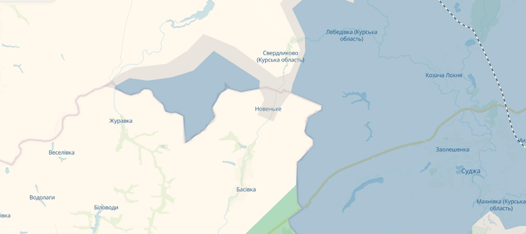 Згідно з картою, російській армії вдалося просунутися біля н.п. Свердліково в Курській області. Водночас територія в районі села Новеньке відображається як "сіра" зона.