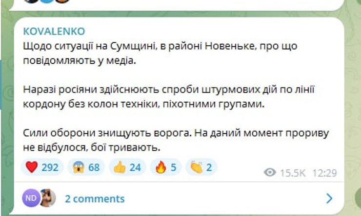 "Щодо ситуації на Сумщині, в районі Новенького про що повідомляють у медіа. Зараз росіяни здійснюють спроби штурмових дій по лінії кордону без колон техніки, піхотними групами", — проінформував директор ЦПД Андрій Коваленко.