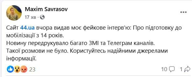 Депутат Верховної Ради Максим Саврасов ("Європейська Солідарність") заперечив, що давав інтерв'ю сайту 44.ua, в якому йшлося про те, що потрібно ставити на військових облік з 14 років. Про це він написав на своїй сторінці в Фейсбук.