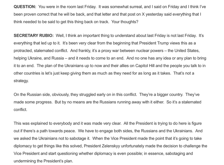 Він додав, що американська сторона попросила українців не саботувати процес із пошуку мирного шляху завершення бойових дій. Втім, президент України Володимир Зеленський, за словами Рубіо, таки зробив це, вирішивши поставити під сумнів слова віцепрезидента США Джей Ді Венса щодо можливостей дипломатії.