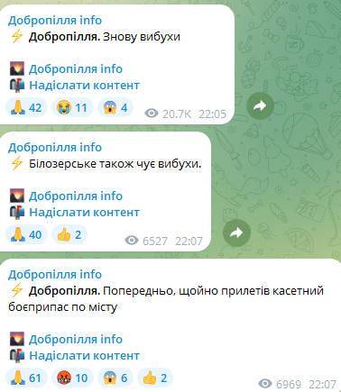 Близько 22:00 години у місті знову було гучно. За попередньою інформацією місцевого Telegram-каналу, по Добропіллю росіяни били касетними боєприпасами.