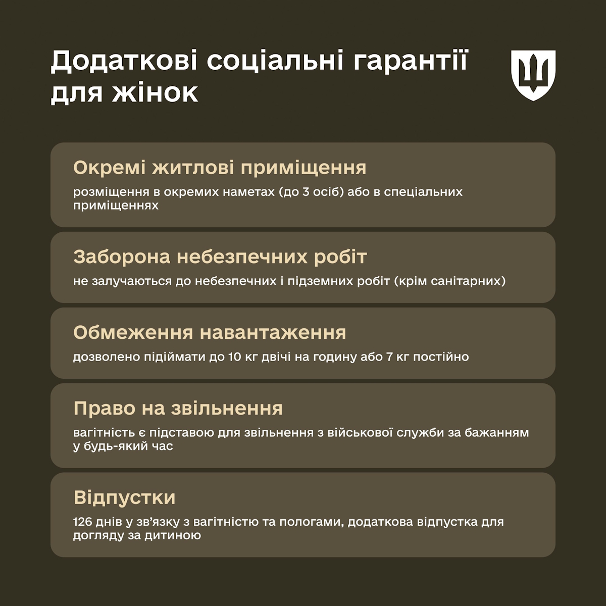 Водночас законодавство передбачає додаткові соціальні гарантії, серед яких: окремі службові приміщення для розміщення під час розгортання таборів, обмеження щодо фізичних навантажень, тобто жінкам дозволено підіймати до 10 кг двічі на годину або 7 кг постійно, можливість звільнення за бажанням у разі вагітності, 126 днів у зв'язку з вагітністю та пологами, додаткова відпустка для догляду за дитиною тощо.