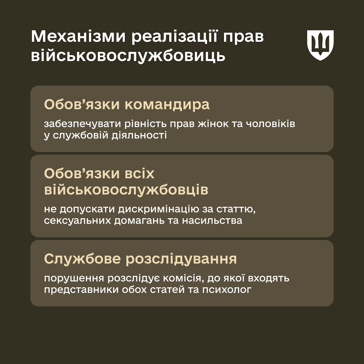 Жінки у ЗСУ мають рівні права з чоловіками на зайняття посад, кар’єрне зростання та військові звання.