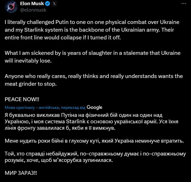 "Кожен, кому це дійсно небайдуже, хто дійсно думає і дійсно розуміє, хоче, щоб м'ясорубка зупинилася", — зауважив Ілон Маск.
